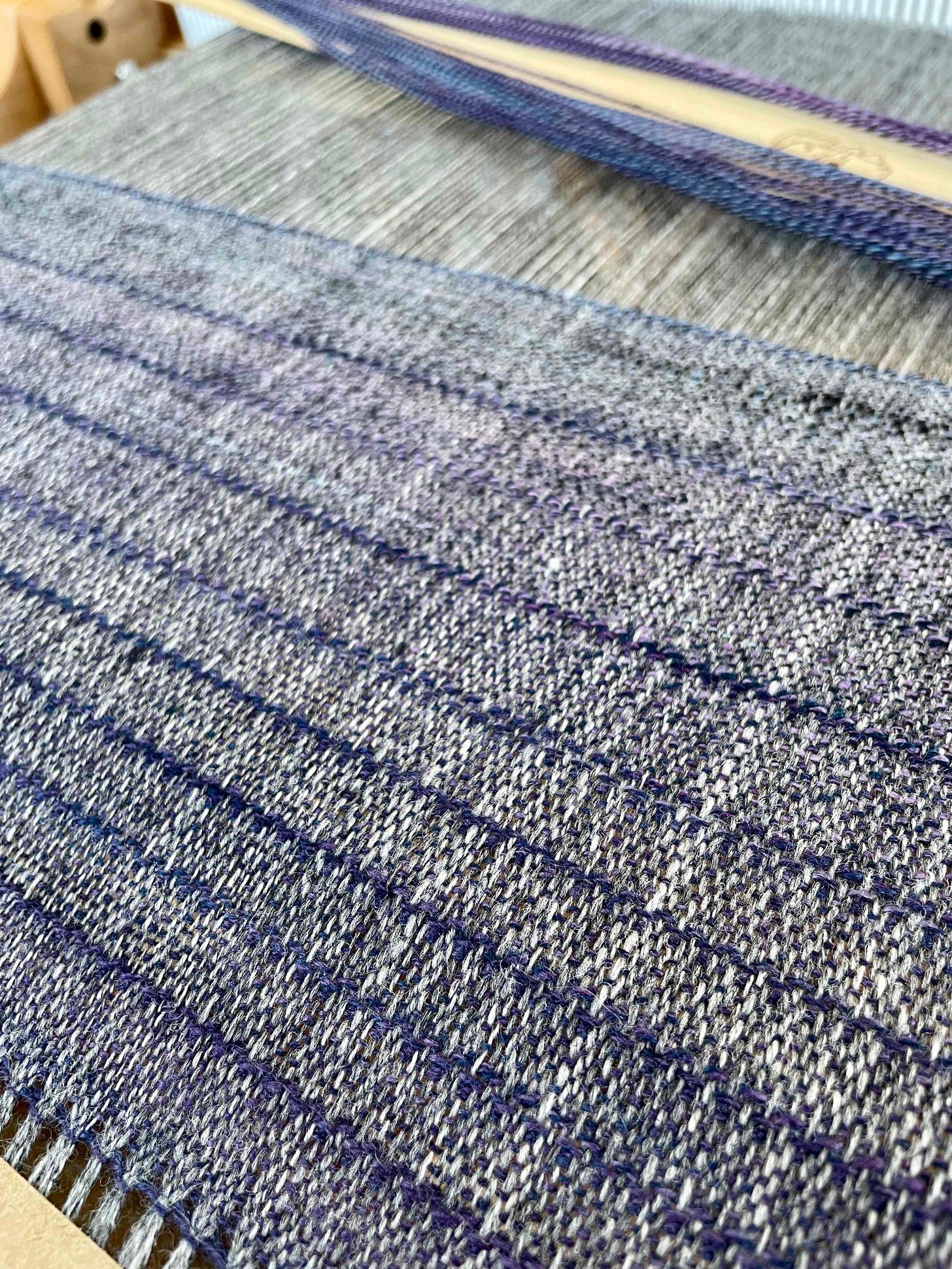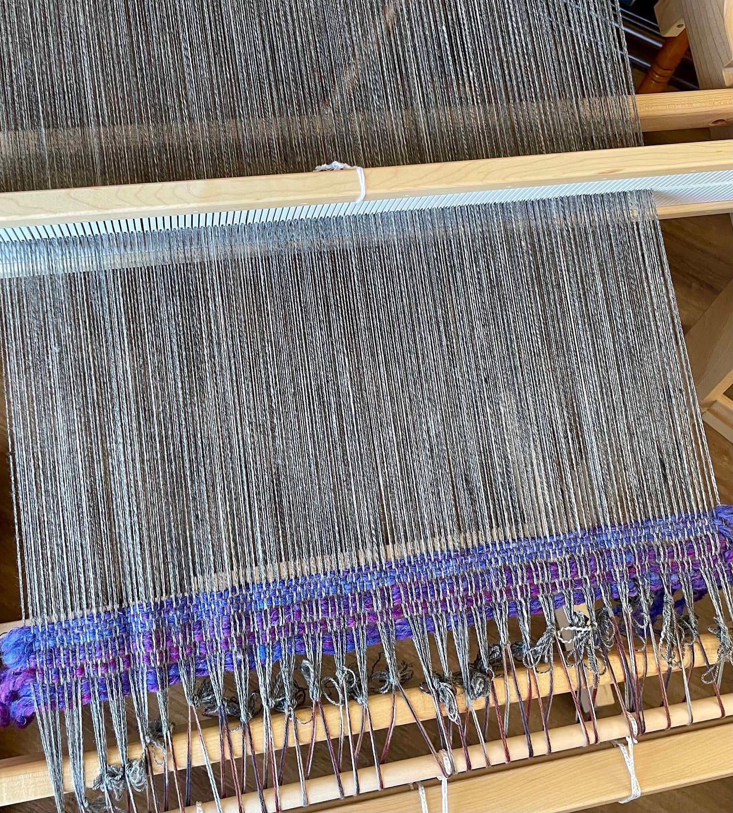 You might have to zoom into the photo to see, but because of the way the heddle was threaded — two in the slots, two in the holes — the “plain weave” wasn’t plain weave.1 Which. Duh. You’d think that would be obvious, but somehow it didn’t actually make sense to me until I was doing it. And the weft yarn was overwhelming the warp — all I could see was the purple I was weaving with. So I took it out and considered my options.