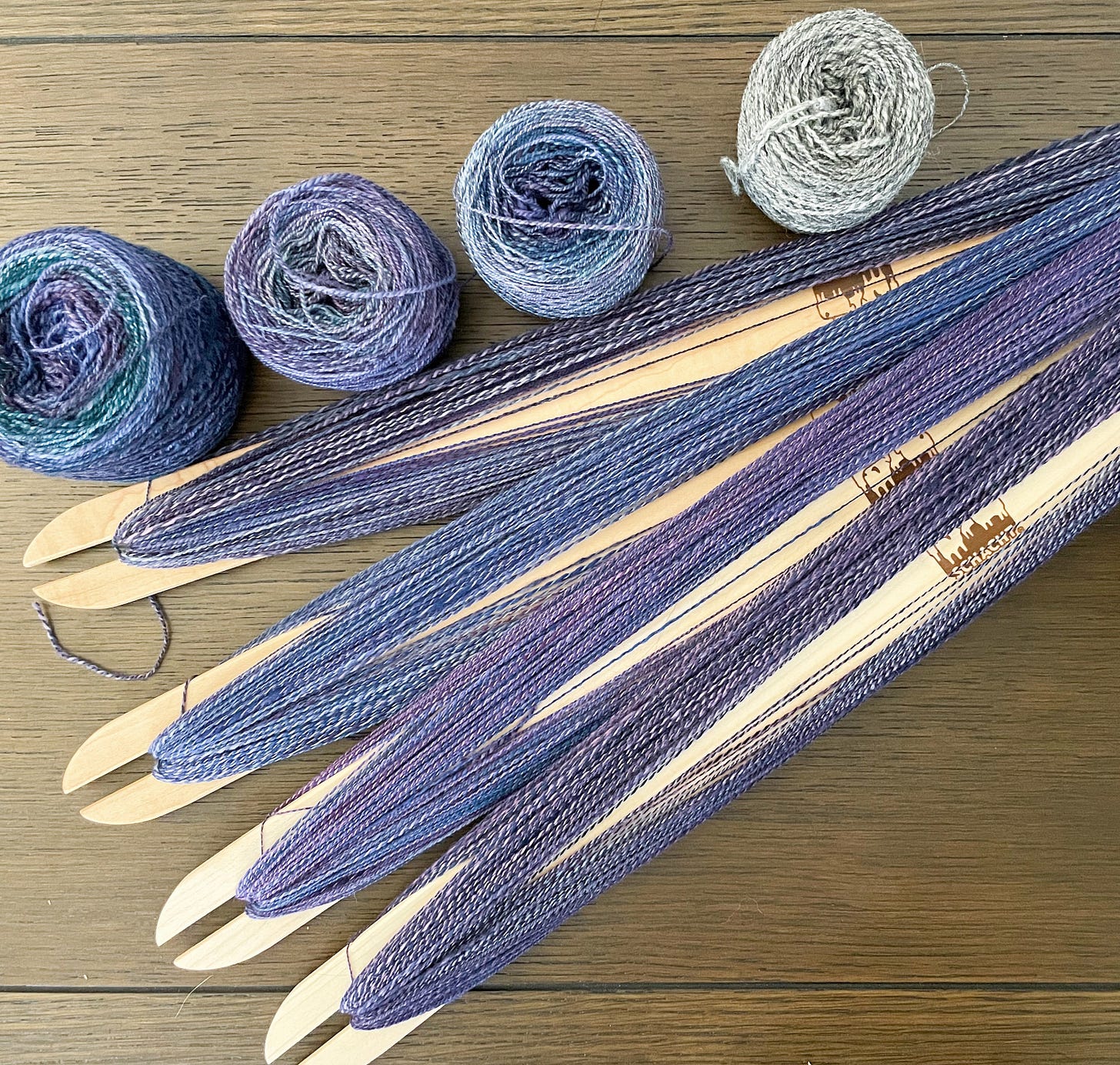 A slight jump ahead, but I want to put this next photo somewhere — once the loom was warped, I wound the weft yarn onto shuttles (these long sticks with notches at the ends). The yarn isn’t a gradient, but I still wanted to keep the colors in the order they were, so that involved making several smaller balls of yarn and winding them onto shuttles, then making sure to keep everything organized.